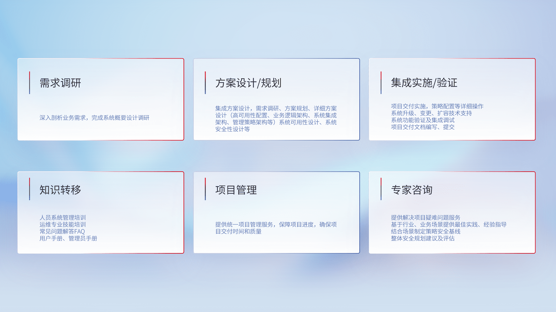 针对客户行业特性,,,,将宏观的安全战略和需求,,通过专业的交付服务,,,,实现项目落地,,,,为客户提供标准规范的集成交付服务。。。